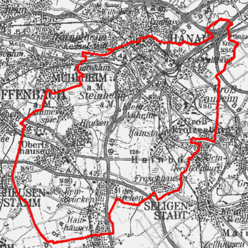 Main aufwärts- abwärts bis Mühlheim, Rodgau aufwärts bis Rodgau-Jügesheim.